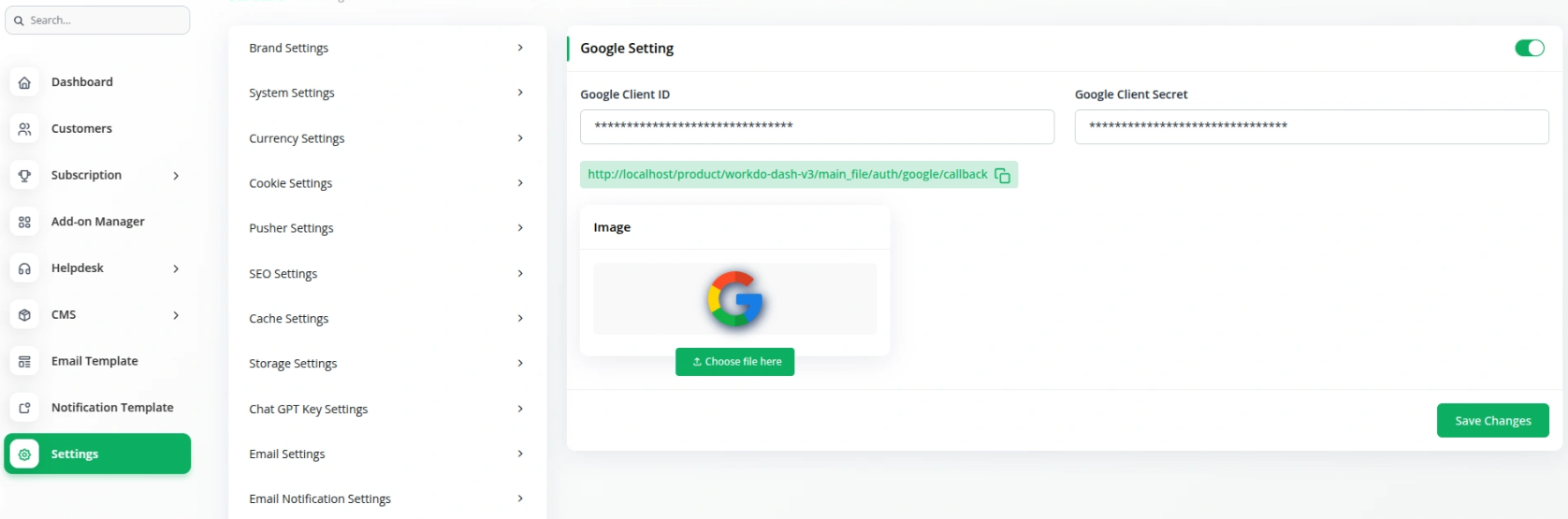 Super Admins can configure Google login by entering the Client ID, Secret, and uploading a login button logo. A toggle switch allows full control over enabling or disabling the option on the login and registration pages.